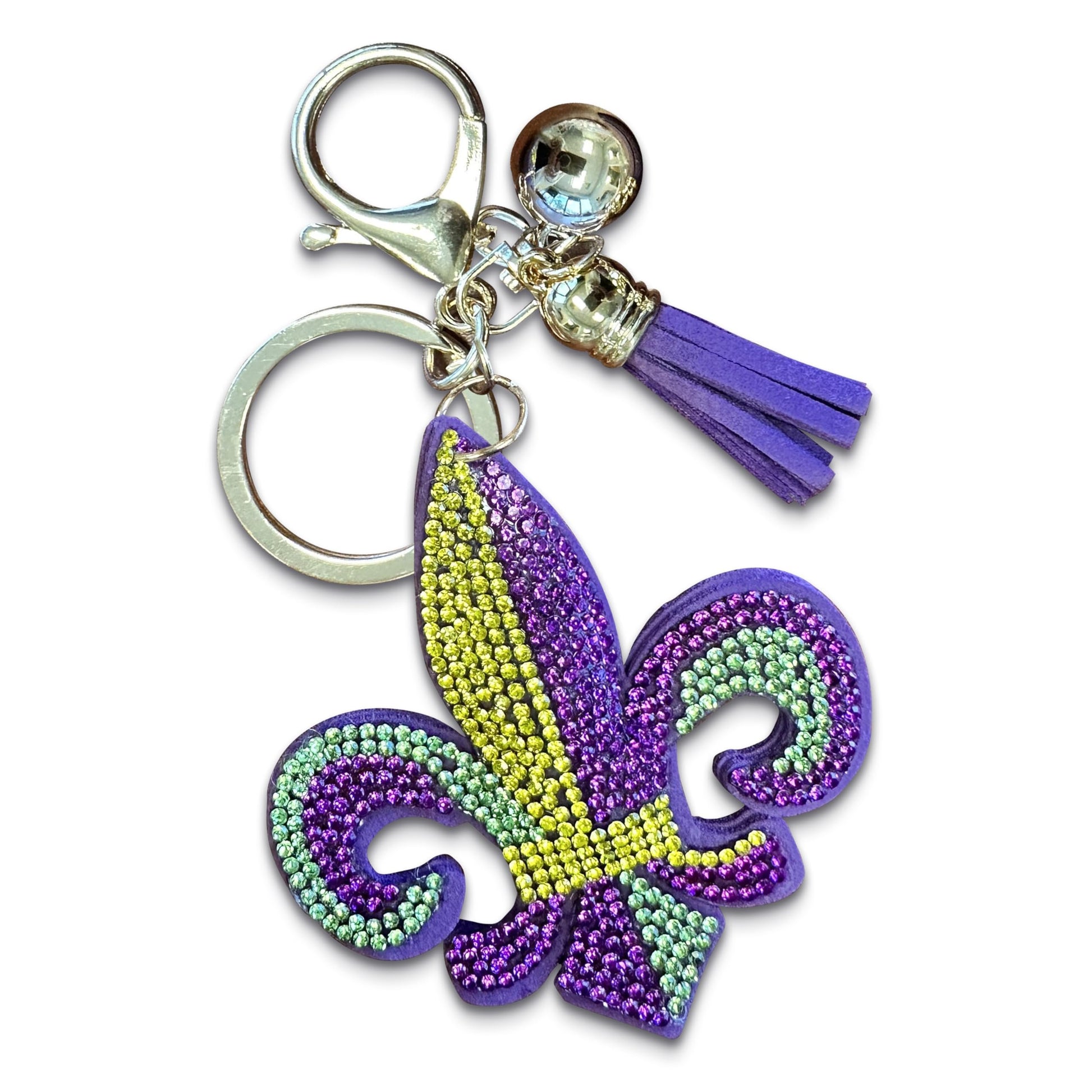 Mardi Gras Fleur-de-Lis Keychain - Purple, Green, and Gold Rhinestone Bag Clip - New Orleans Themed Purse Charm