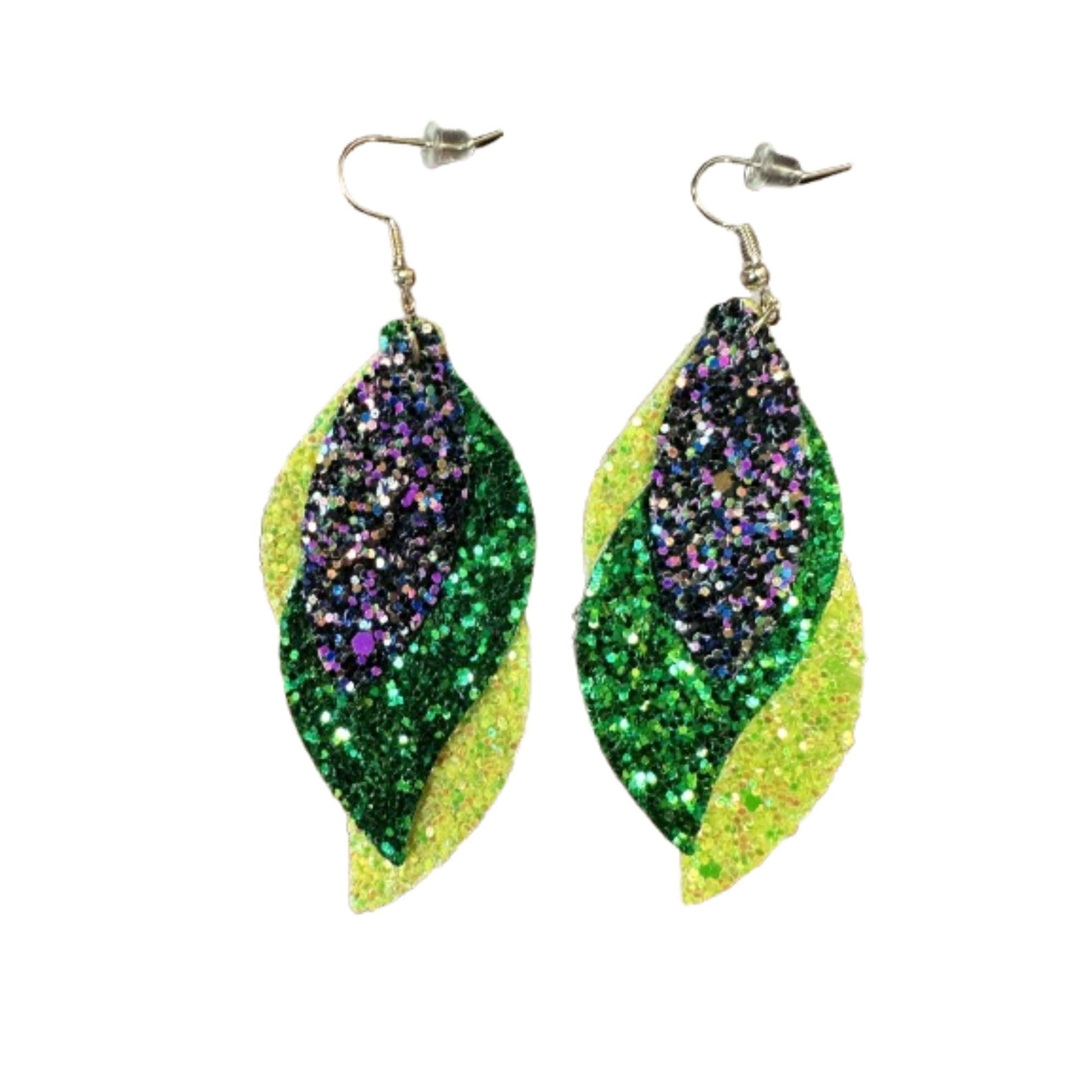 - FESTIVE MARDI GRAS GLAM - Celebrate Mardi Gras with these stunning earrings that embody the vibrant spirit of the season. Featuring a bold combination of green, gold, and purple glitter, these earrings capture the essence of Carnival and ensure you stand out at parades, parties, and festivals. Their unique leaf-shaped design adds an elegant touch, making them both festive and chic.