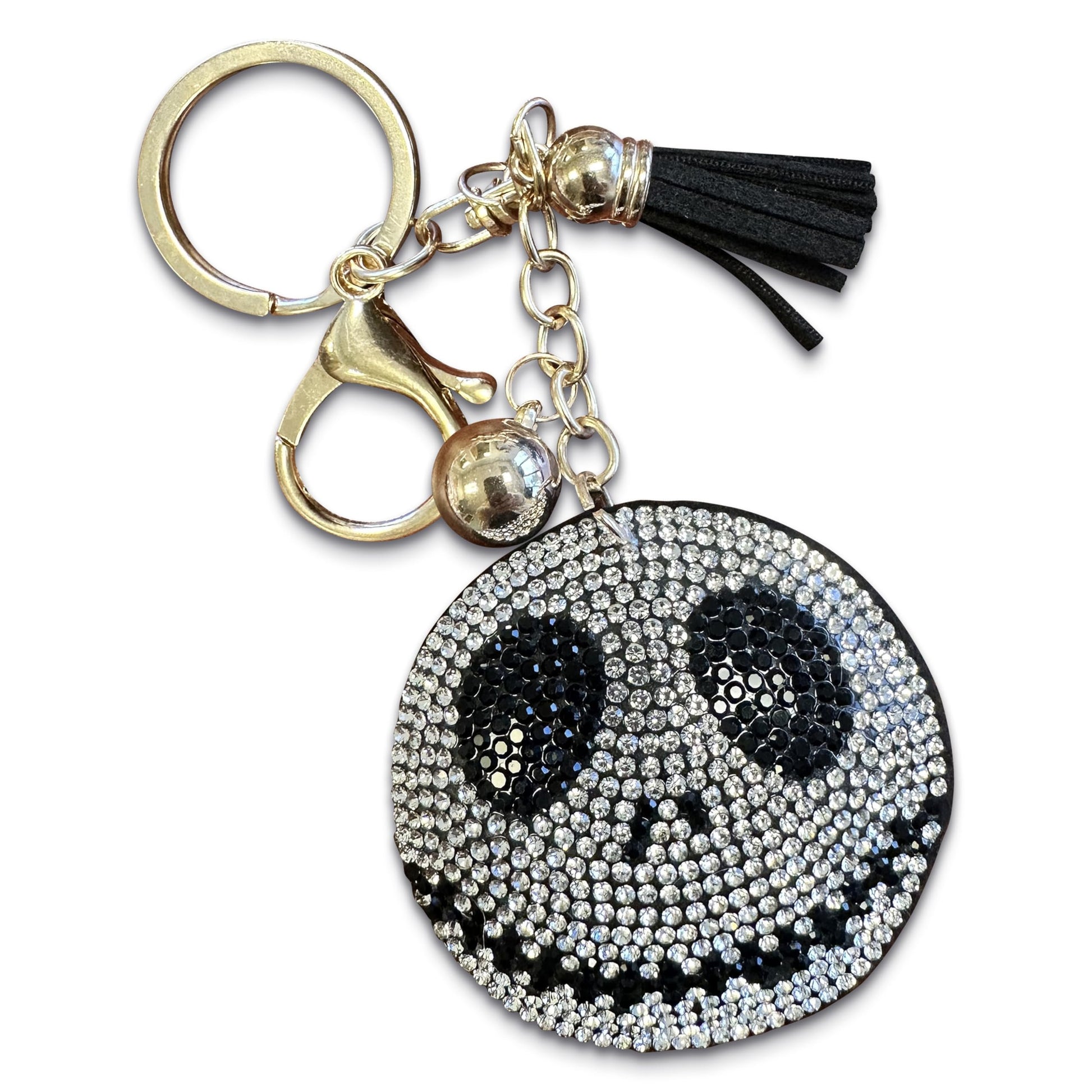 Celebrate your love for iconic Halloween characters with this dazzling silver rhinestone skull keychain, purse charm, and bag clip. Featuring a design inspired by classic spooky tales, this accessory showcases a skull face with large, dark eyes and a stitched smile, bringing a touch of gothic elegance to your everyday style. Perfect for fans of dark fantasy and Halloween themes, this versatile charm can be used to adorn your handbag, backpack, or keys, adding a bit of silver sparkle and spooky fun to any outfit. The black tassel adds an elegant touch, making this keychain not only a tribute to your favorite spooky stories but also a chic fashion statement. Crafted with high-quality materials, including securely set silver rhinestones and durable hardware, this accessory is built to last. It's a thoughtful gift for anyone who loves iconic Halloween characters, gothic fashion, or sparkling, unique accessories.